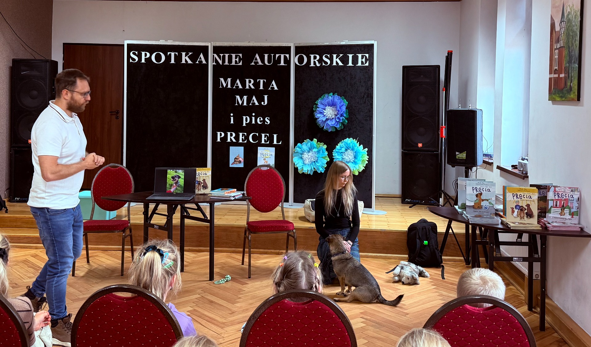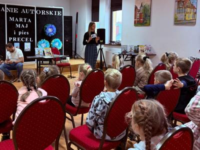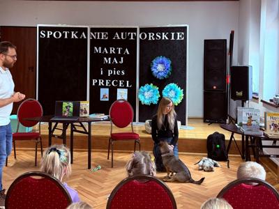 Wtorkowe przedpo艂udnie w naszej bibliotece zamieni艂o si臋 w prawdziw膮 literack膮 uczt臋 – wszystko za spraw膮 niezwyk艂ego duetu: pisarki Marty Maj i jej psa Precla.